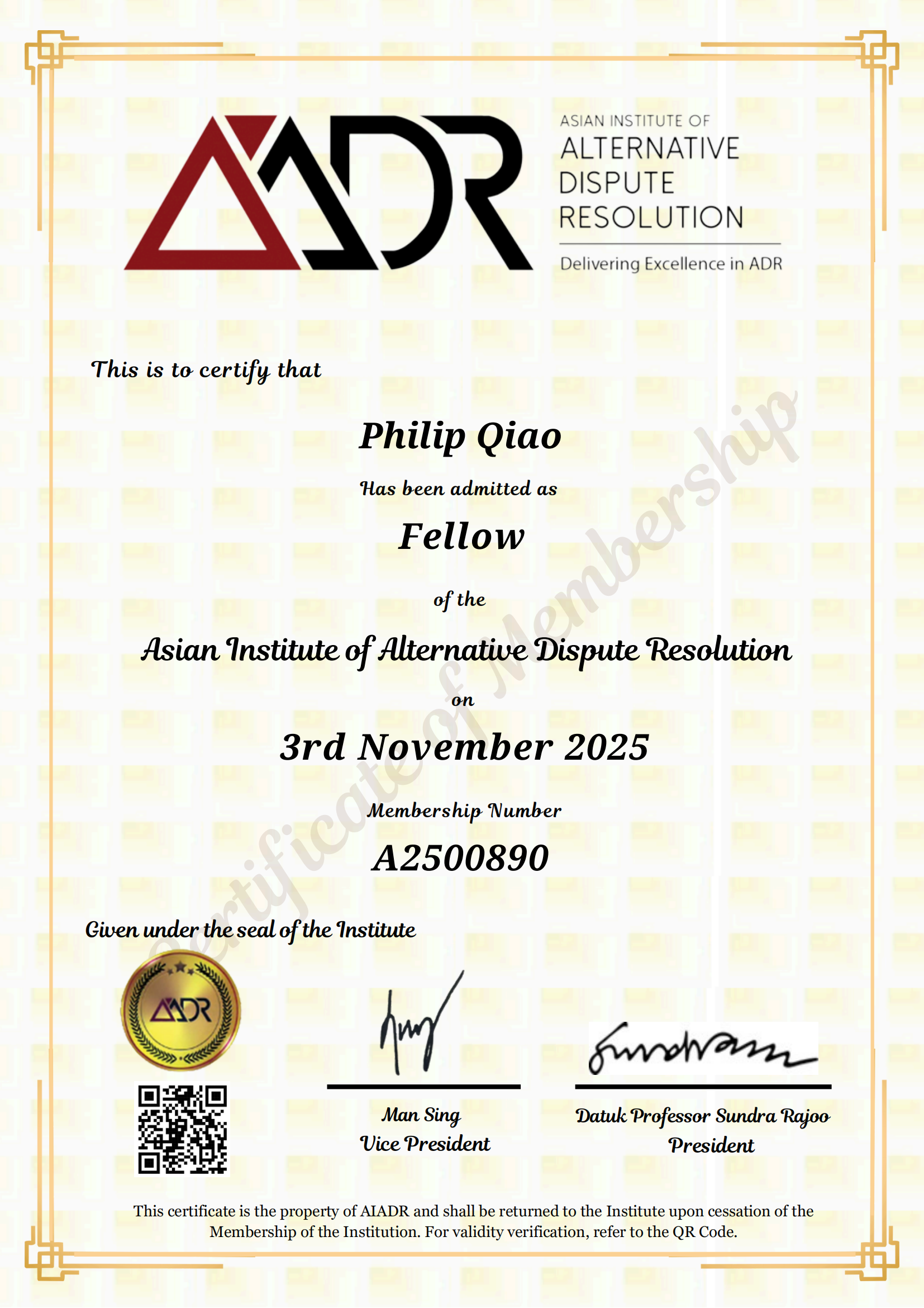 Lawyer Qiao Huanran (Philip Qiao), Partner of our firm, has successfully been approved as a Fellow of the Asian Institute of Alternative Dispute Resolution (AIADR)